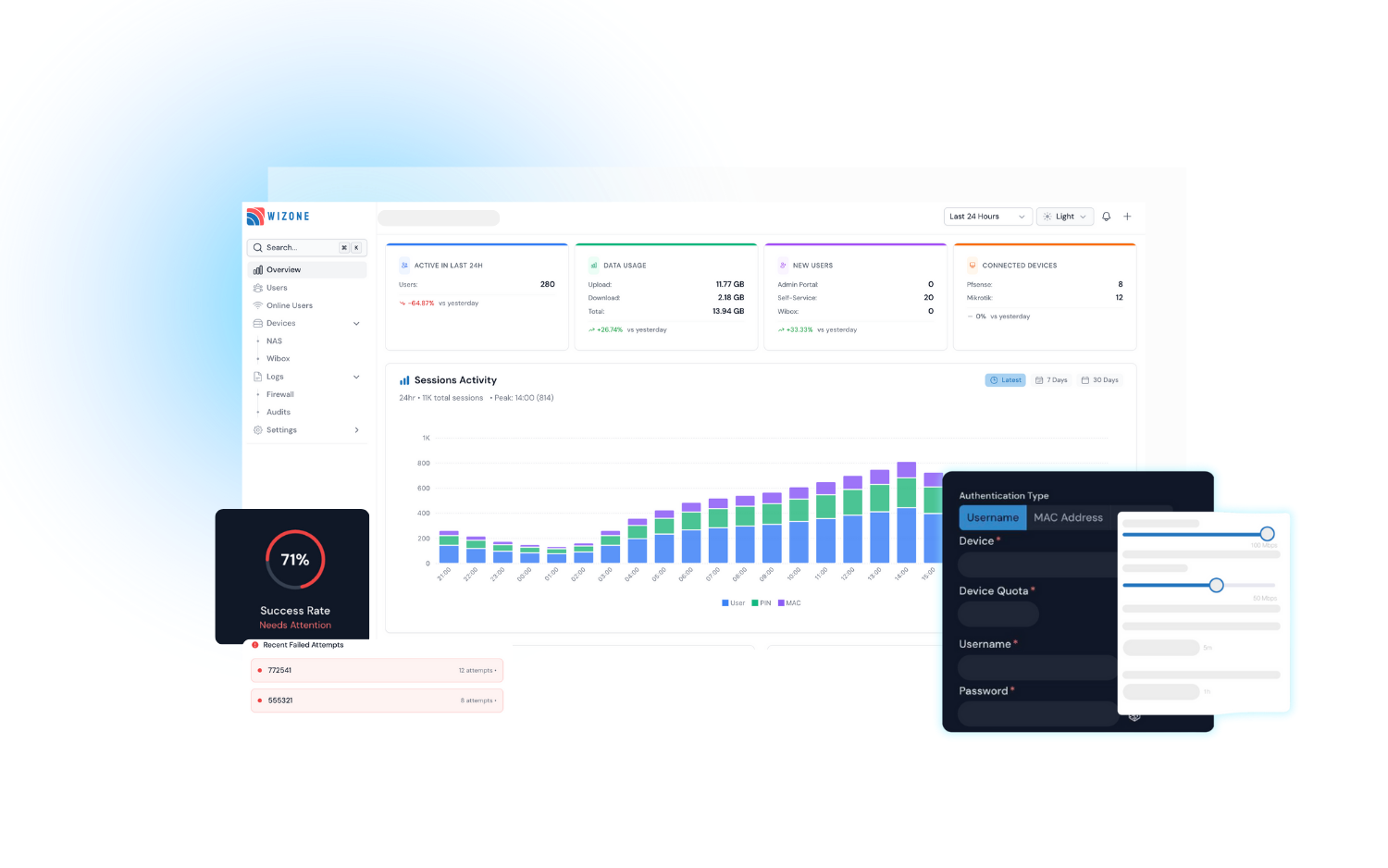 ไม่ว่าจะเป็นการจัดการผู้ใช้งาน หรือตรวจสอบภาพรวมประวัติการเชื่อมต่อ WiZone รวมทุกข้อมูลสำคัญมาไว้ในรูปแบบที่เข้าใจง่ายและตรวจสอบย้อนหลังได้